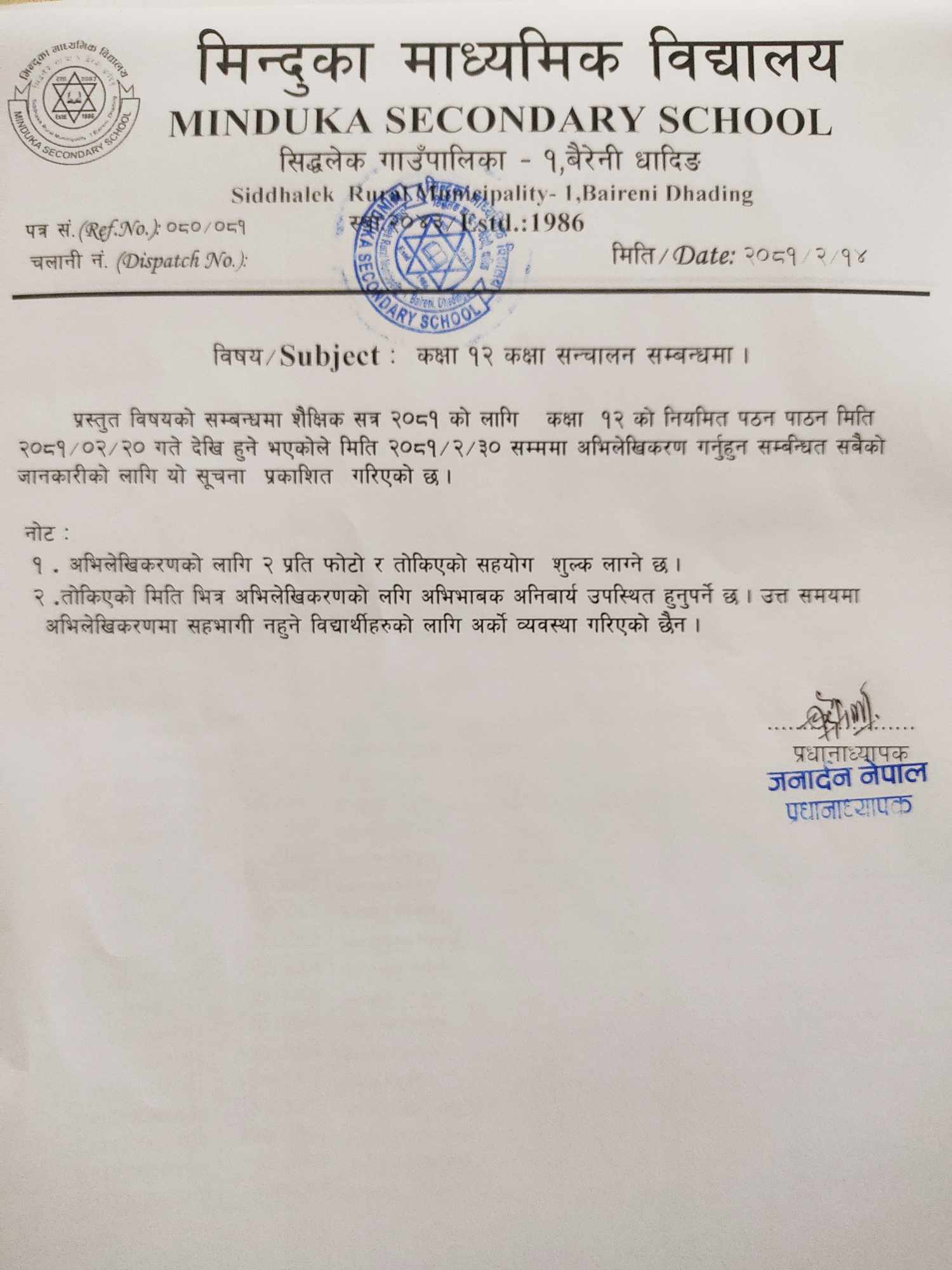 कक्षा 12 काे नियमित कक्षा सन्चालन सम्बन्धि सूचना