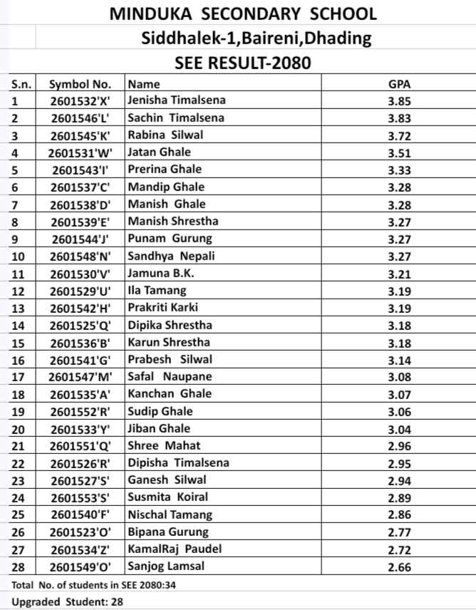 शैक्षिक सत्र २०८० काे कक्षा ईसीडि देखि कक्षा ७ सम्म र कक्षा ९ काे वार्षिक परीक्षाकाे नतिजा प्रकाशित गरिएकाे छ।